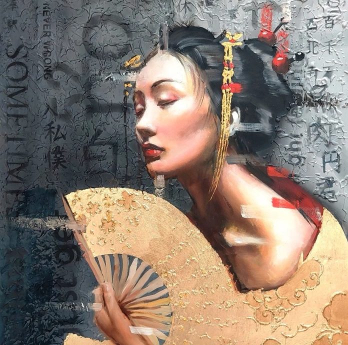 L’opera fa parte della serie “Japan in gold” , che conta altre 3 tele. Immagine di copertina : Kangae, pasta materica e olio su tela, 50x70 Scent Of Art, spazio di divulgazione artistica a cura di Maria Marchese