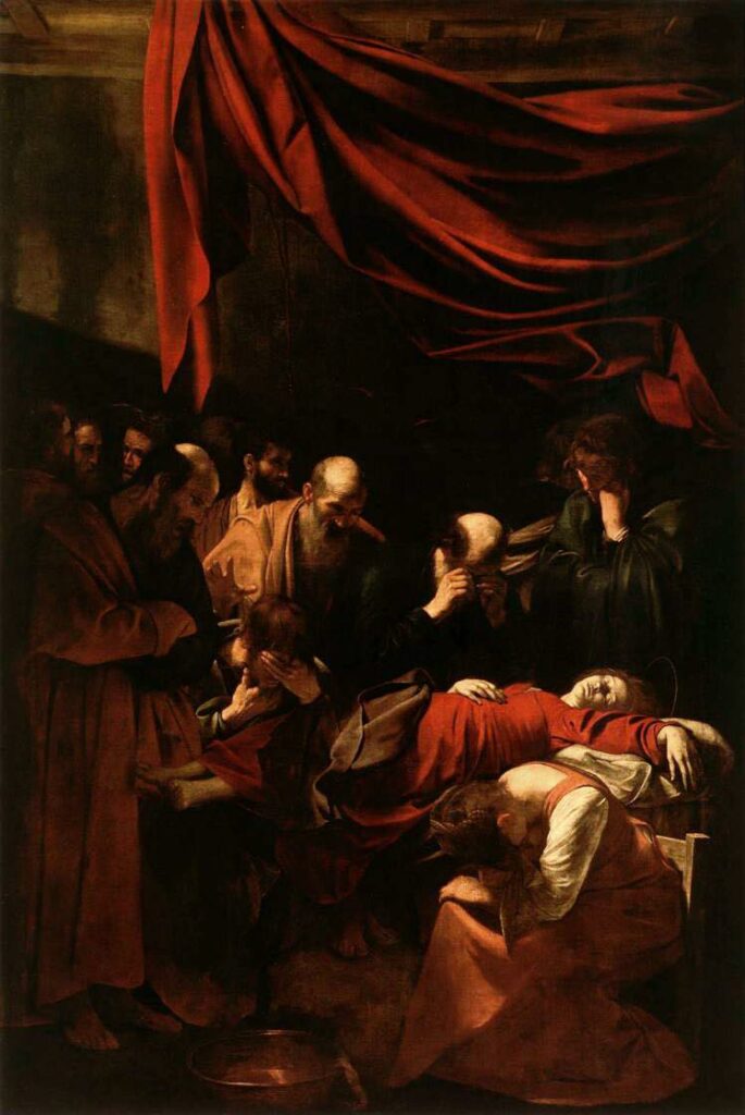 Sotto, il corpo della Vergine è disteso, gonfio, pesante, immerso in un silenzio che nessuna fede sembra infrangere.