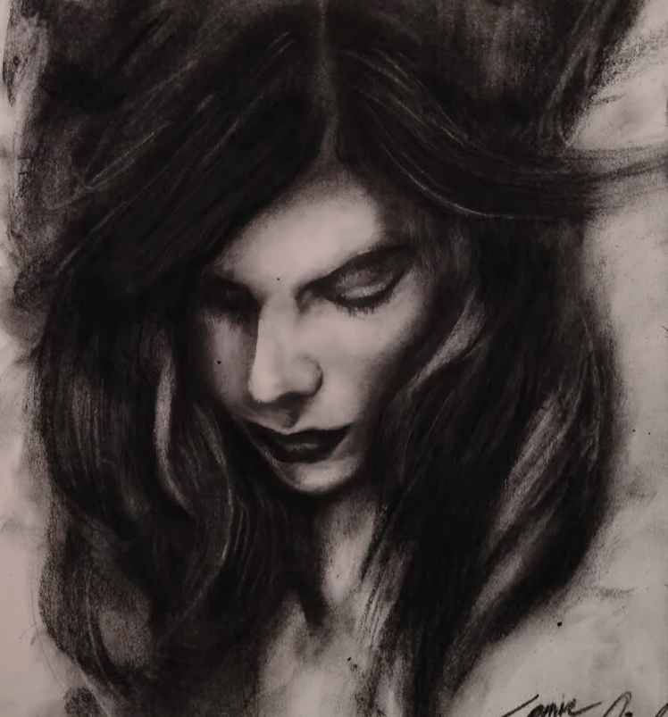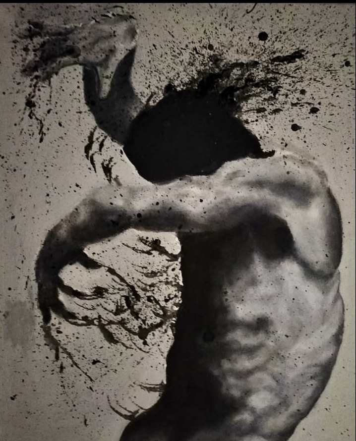 È il momento in cui il rumore esterno si spegne e resta il dialogo interiore. Un dialogo spesso duro, severo, non conciliatorio.La componente tecnica sostiene con forza questa visione. Il carboncino e la grafite non sono strumenti casuali: permettono un lavoro chirurgico sul chiaroscuro, sulla densità del nero, sulla costruzione volumetrica del corpo. La luce emerge come taglio netto, quasi caravaggesco, incidendo le forme e trasformando l’anatomia in linguaggio emotivo.