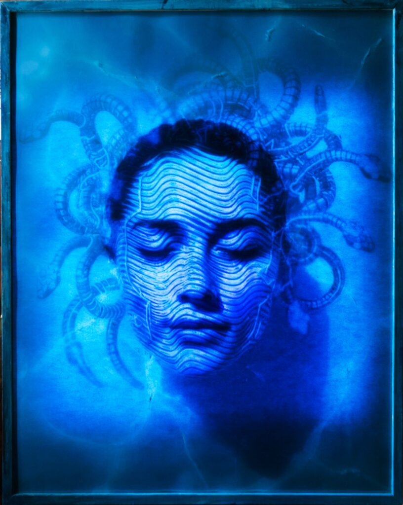 L’opera “Medusa” di Isabella Giovanardi (90 x 73 cm), realizzata su stampa in acetato con interventi in acrilico e luce LED, si colloca all’interno di una riflessione sul femminile, rielaborando una delle figure mitologiche più controverse della tradizione occidentale.