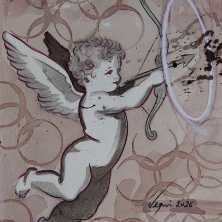 È un Cupido sospeso nel tempo quello che Miky Degni affida alla carta nel formato 35 x 50 centimetri. Non il dio capriccioso dell’amore che colpisce alla cieca, ma una figura che sembra scegliere con consapevolezza il proprio bersaglio.